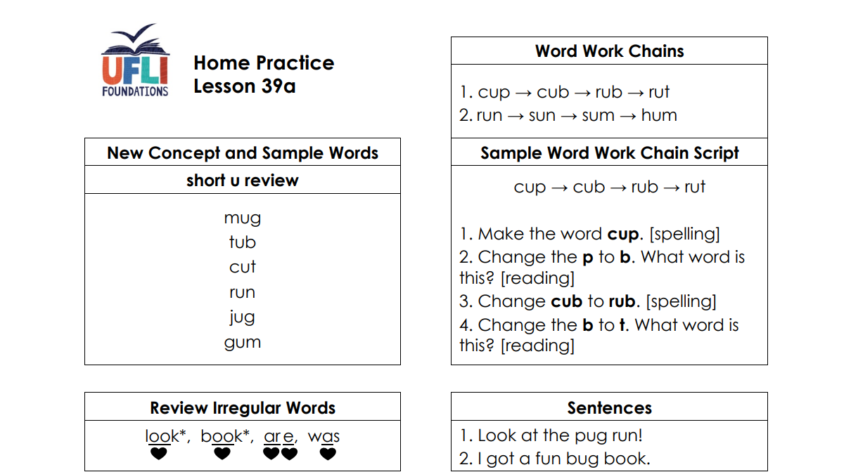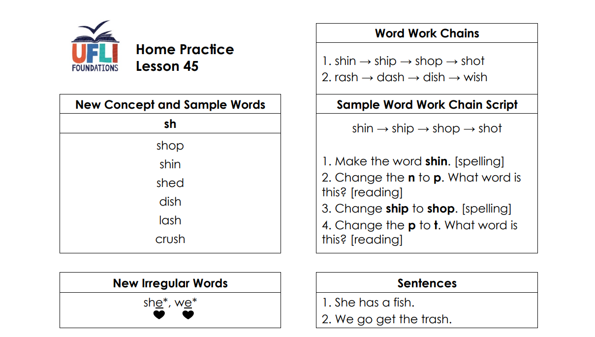 The UFLI Home Practice sheets provide a way for students to build literacy skills at home in a way that directly connects to what they're learning at school. Here is a step-by-step explanation of how you can use these sheets with your learner. The home practice sheets will start coming home with lesson 5.