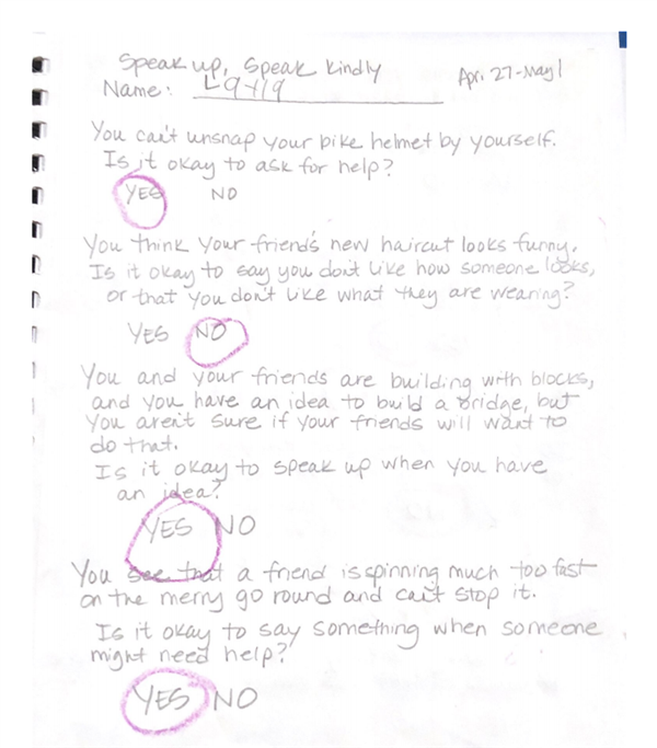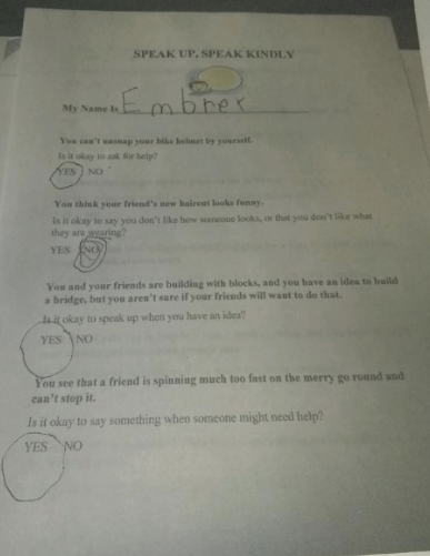 To complete this activity, read the scenarios and circle the correct answer, YES or NO. Be sure to remember that speaking up works best when we are kind and respectful, and when our voice is clear and strong.