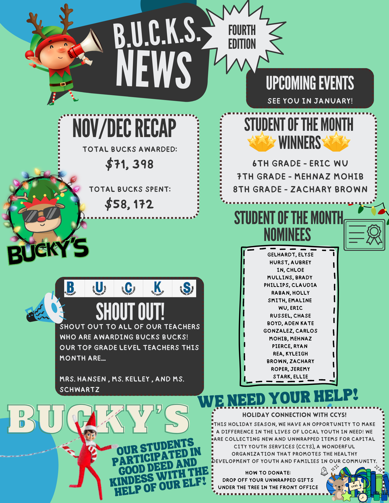 Teachers can reward students as needed, and parents can track their child's BUCKS totals in Focus, with adjustable notification settings available. Students can "cash out" their BUCKS for classroom rewards and Bucky's items (our PBIS School store). Teachers will individually determine their classroom reward "prices". Additionally, we will recognize a "Student of the Month" during morning announcements, with nominations from C-period teachers and a random draw by the grade level AP (one per grade level).